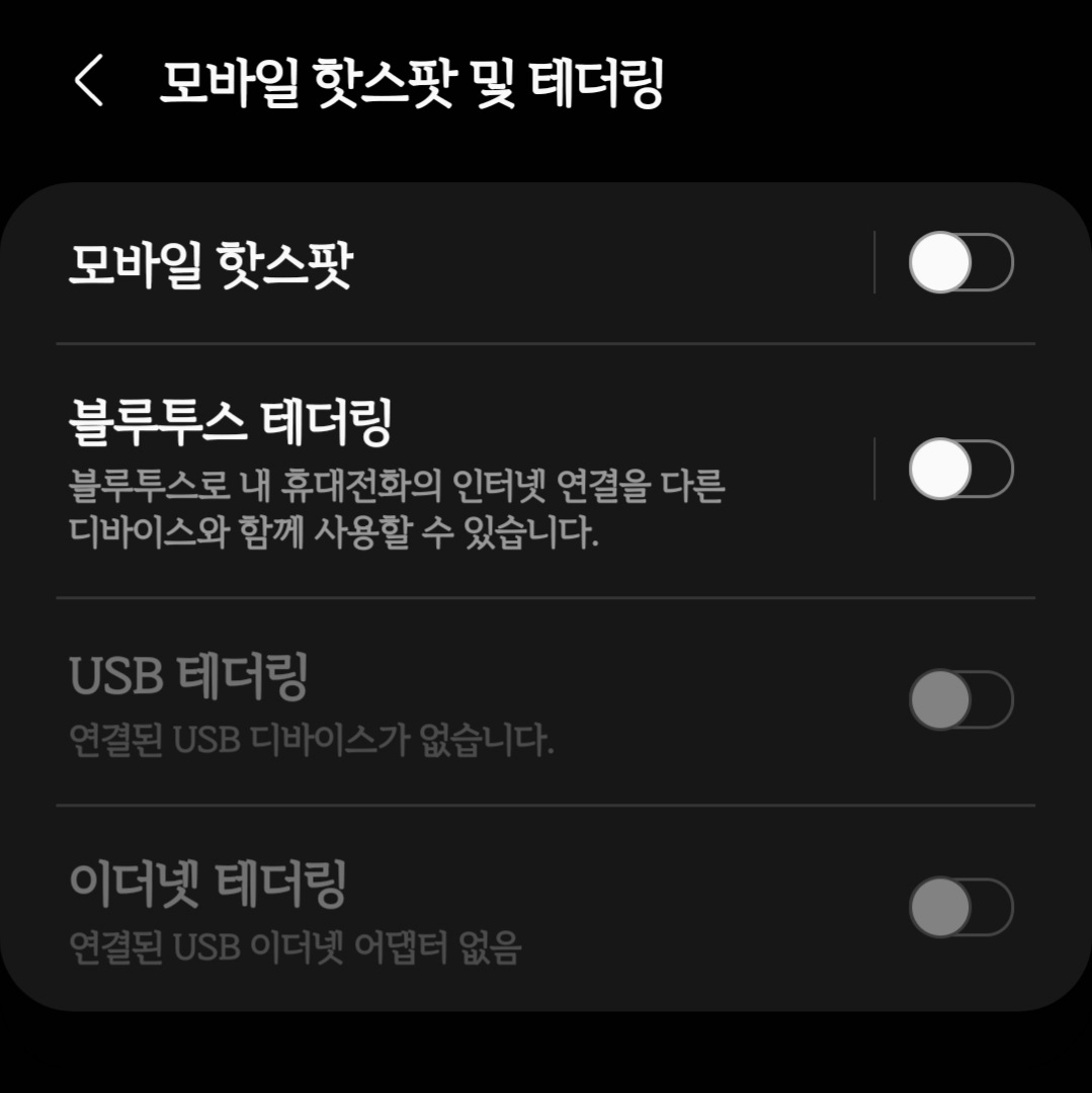 스마트폰 [설정] - [연결] - [모바일 핫스팟 및 테더링] 창으로 들어가면 네 종류의 테더링을 볼 수 있습니다.